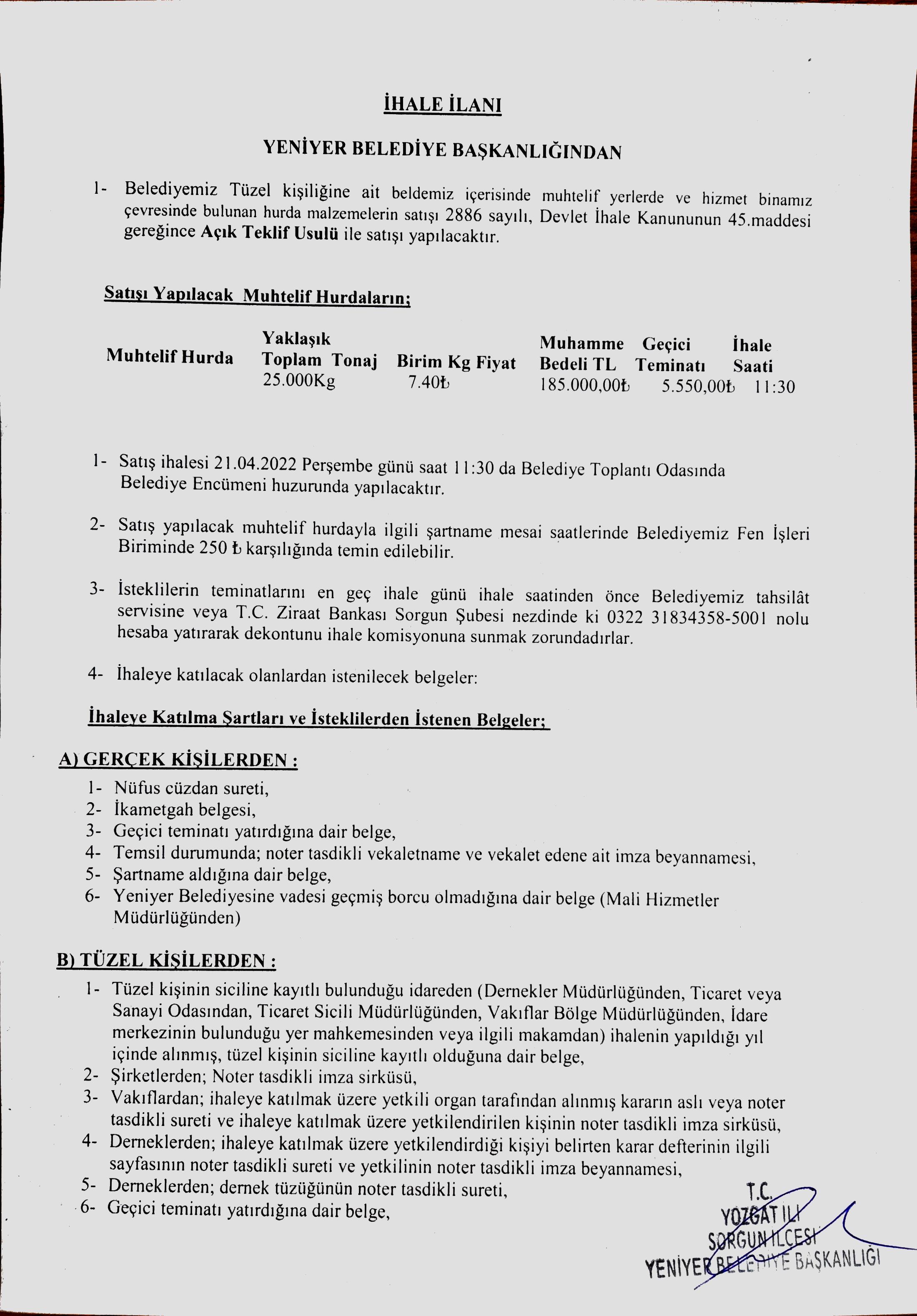 BELEDİYEMİZ TÜZEL KİŞİLİĞİNE AİT BELDEMİZ İÇERİSİNDE MUHTELİF YERLERDE VE HİZMET BİNAMIZ ÇEVRESİNDE BULUNAN HURDA MALZEMELERİN SATIŞI İHALE İLANI