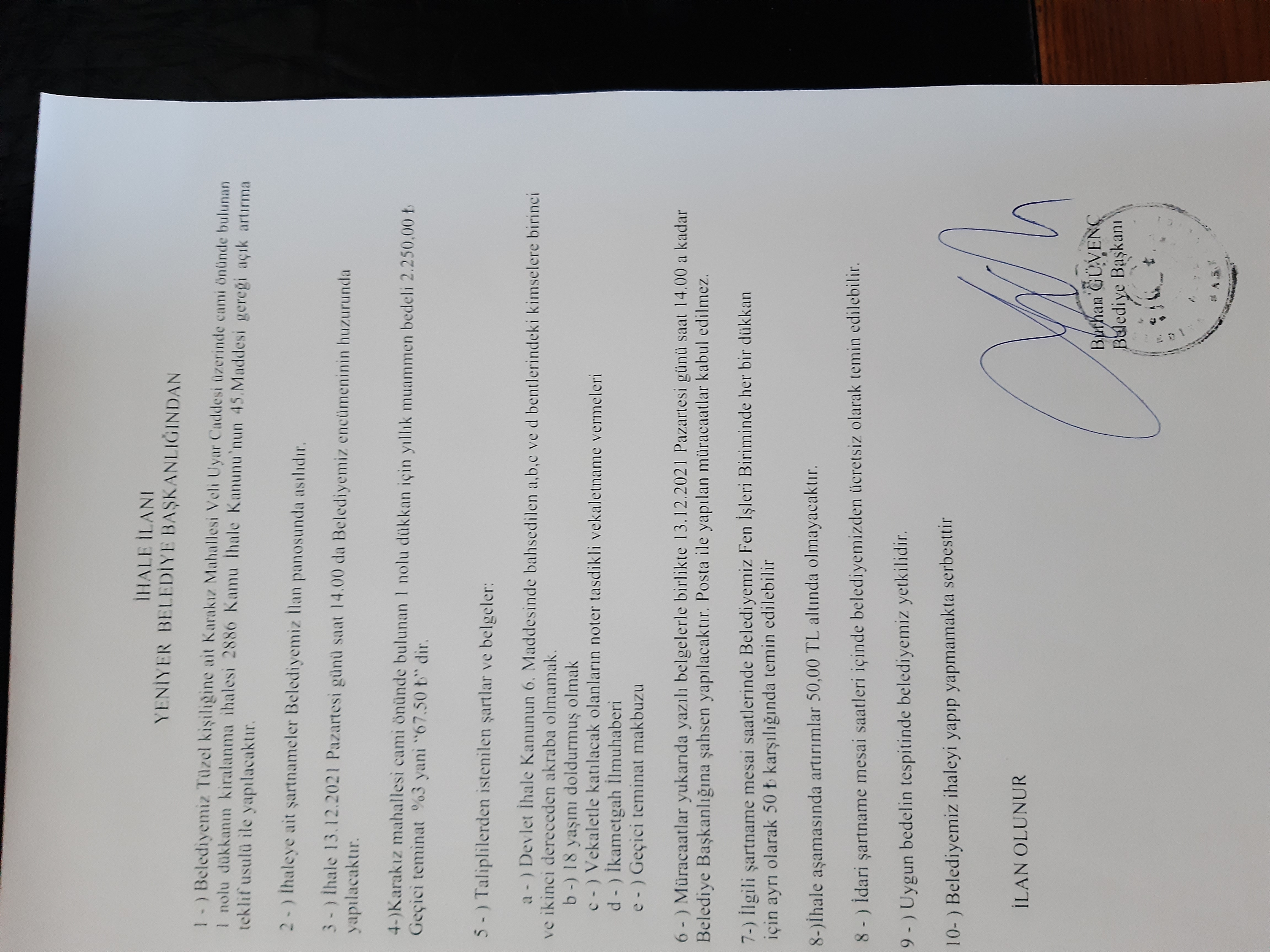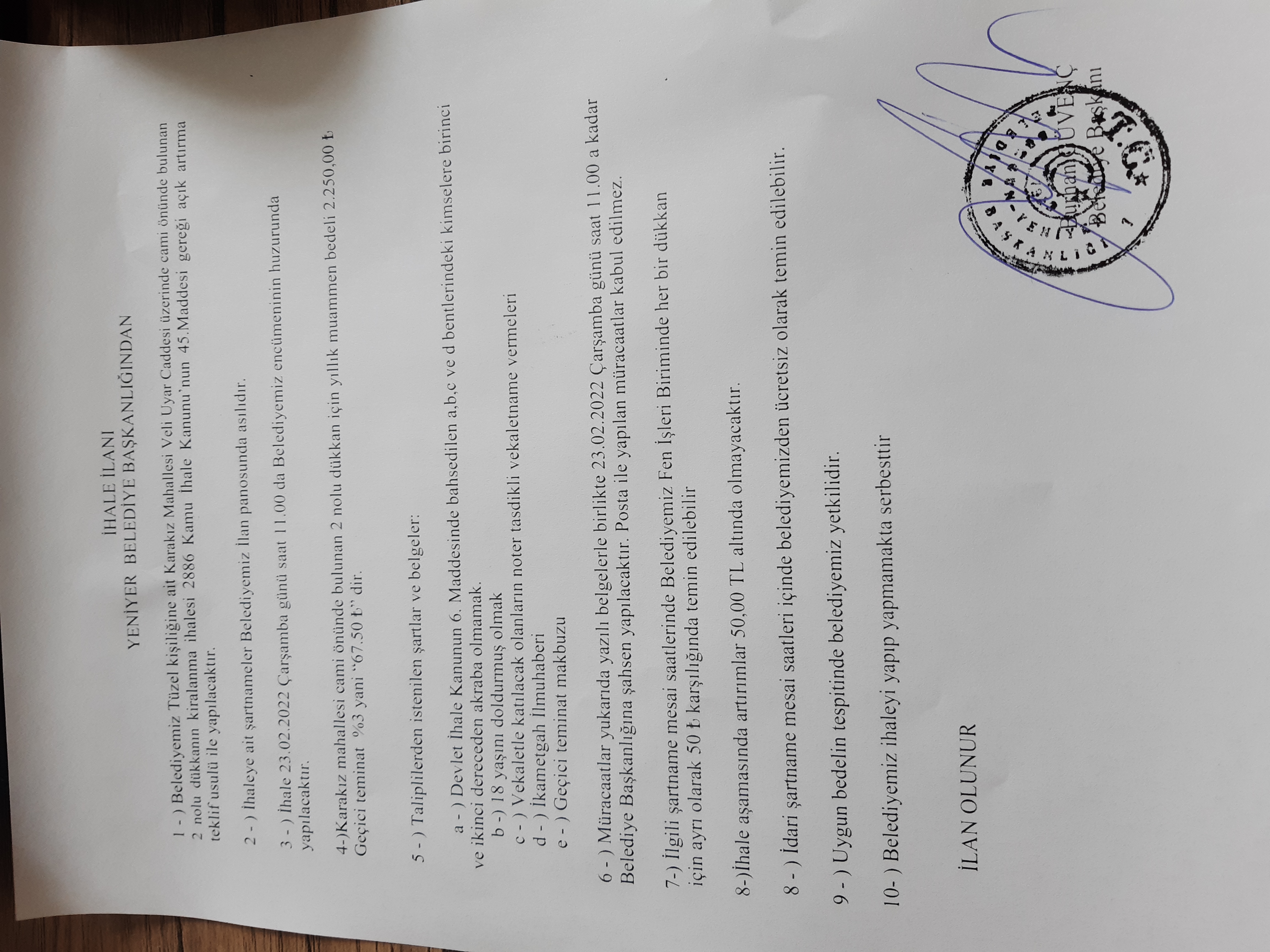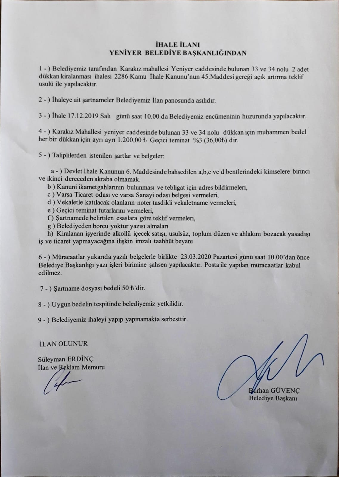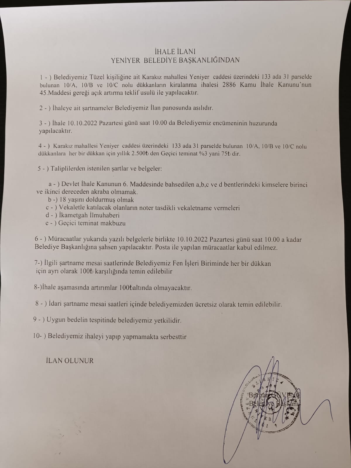 YENİYER BELEDİYESİ TÜZEL KİŞİLİĞİNE AİT KARAKIZ MAHALLESİ YENİYER CADDESİ ÜZERİNDE BULUNAN 10/A 10/B 10/C NOLU DÜKKANLARIN (SELEKTÖR YANI) KİRALANMA İHALESİ İLANI