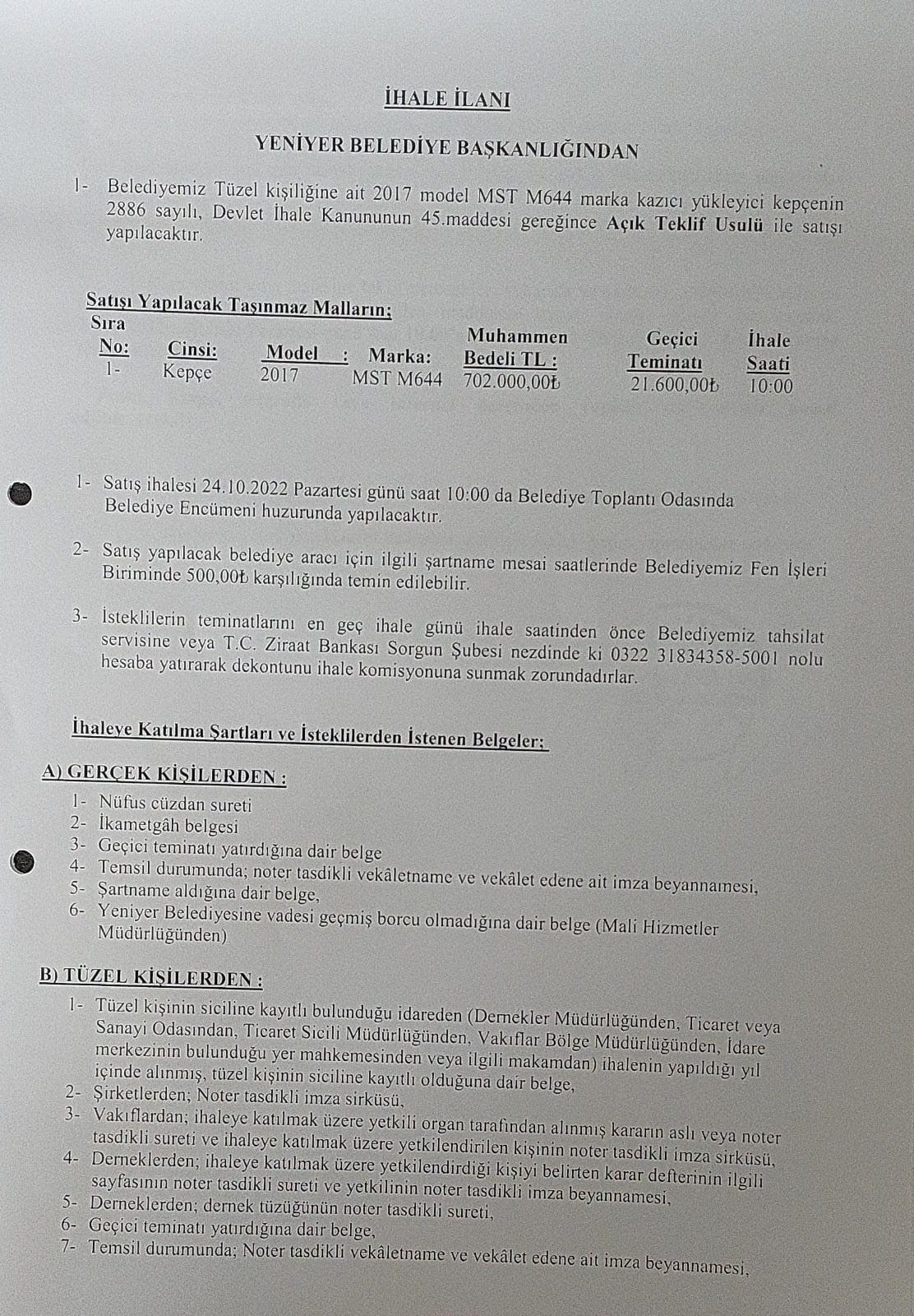 BELEDİYEMİZ TÜZEL KİŞİLİĞİNE AİT 2017 MODEL MST M644 MARKA KAZIYICI YÜKLEYİCİ KEPÇENİN SATIŞ İHALE İLANI