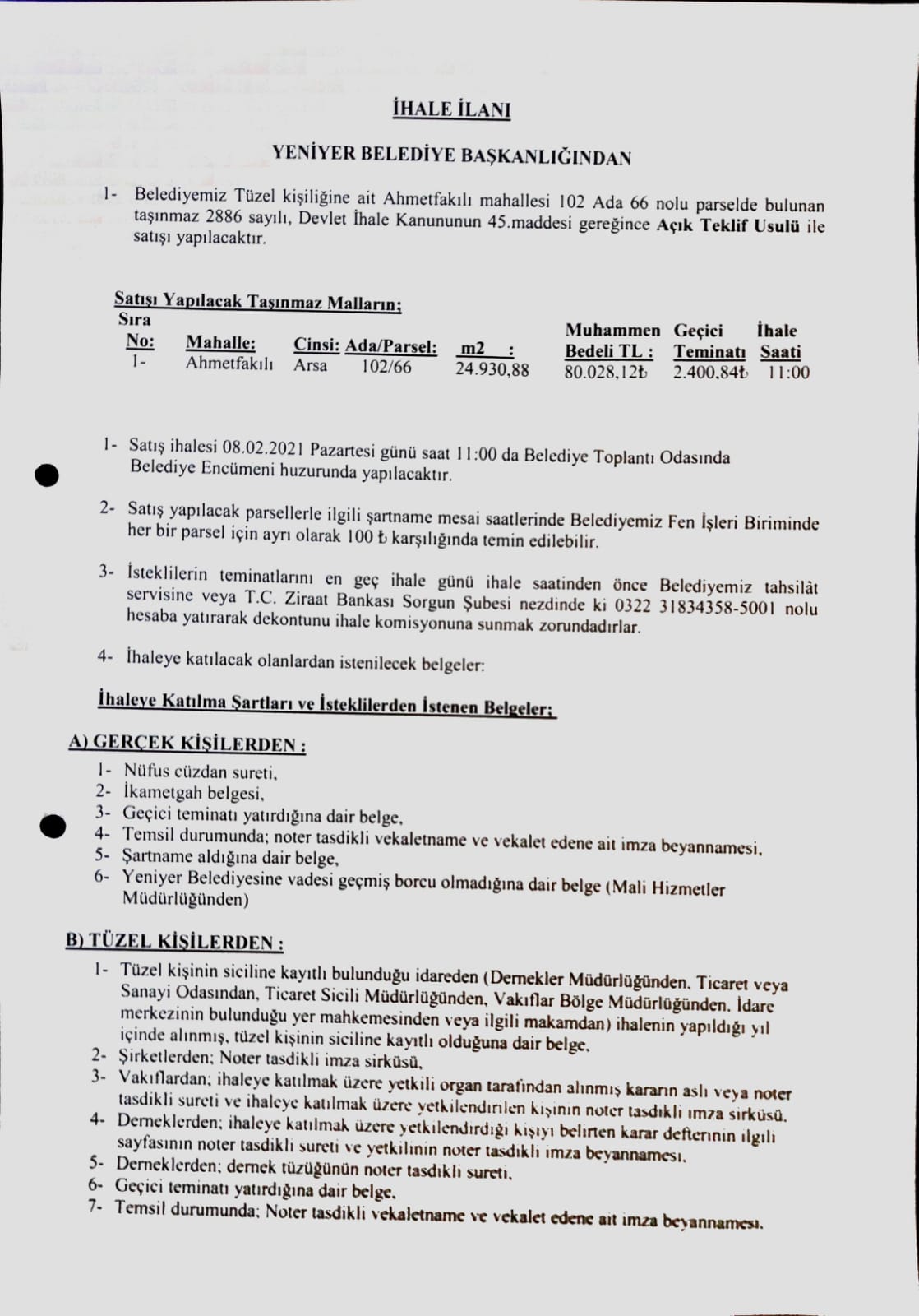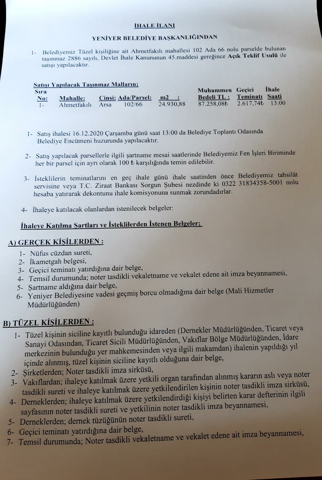 YENİYER BELDESİ AHMETFAKILI MAHALLESİNDE BULUNAN 102 ADA 66 NOLU PARSELİN SATIŞ İHALE İLANI