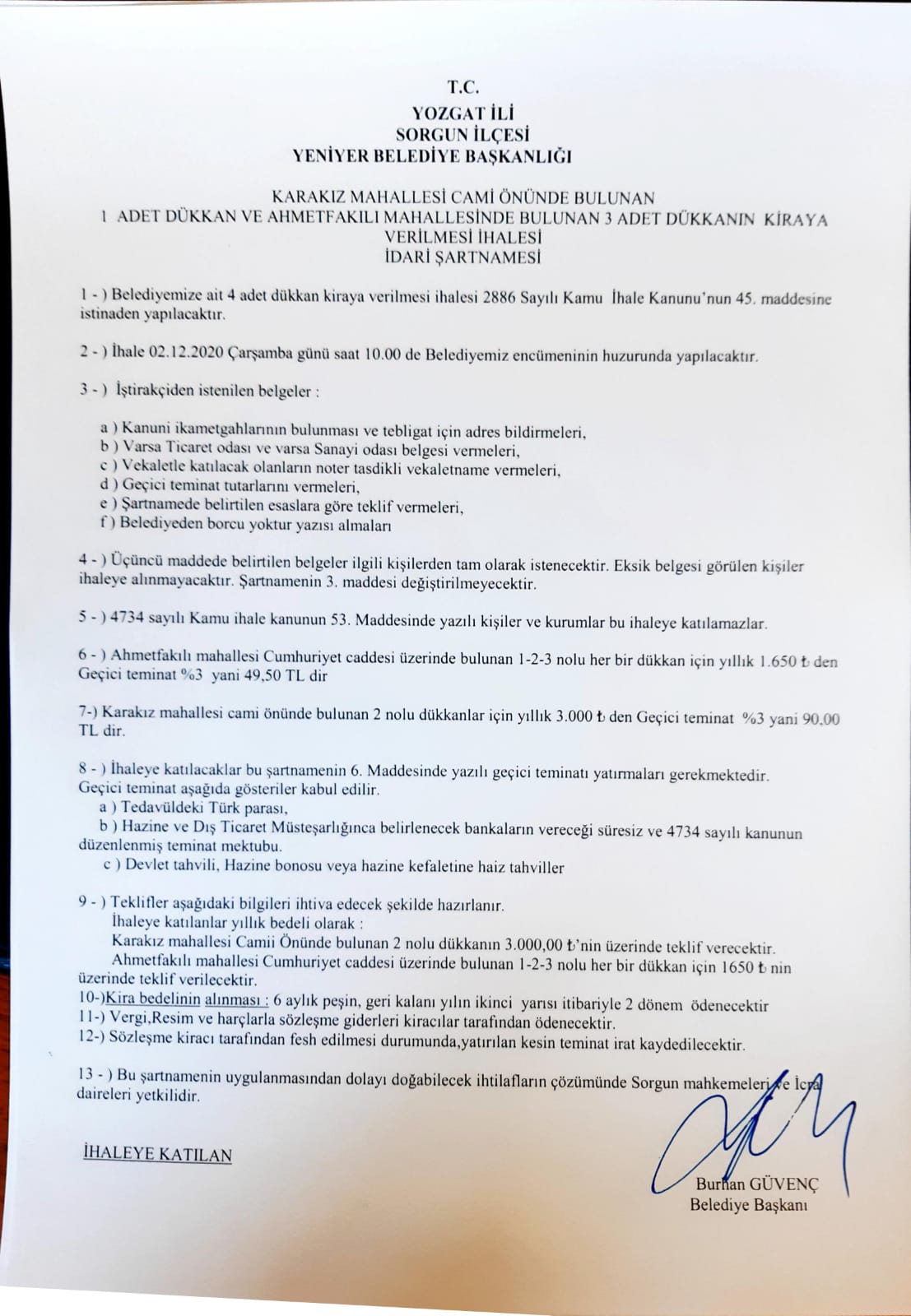 BELEDİYEMİZ TÜZEL KİŞİLİĞİNE AİT AHMETFAKILI MAHALLESİ CUMHURİYET CADDESİNDE BULUNAN 1-2-3 NOLU BELEDİYE DÜKKANLARIMIZ VE KARAKIZ MAHALLESİ CAMİ ÖNÜNDE BULUNAN 2 NOLU BELEDİYE DÜKKANIMIZIN İHALE İLANI