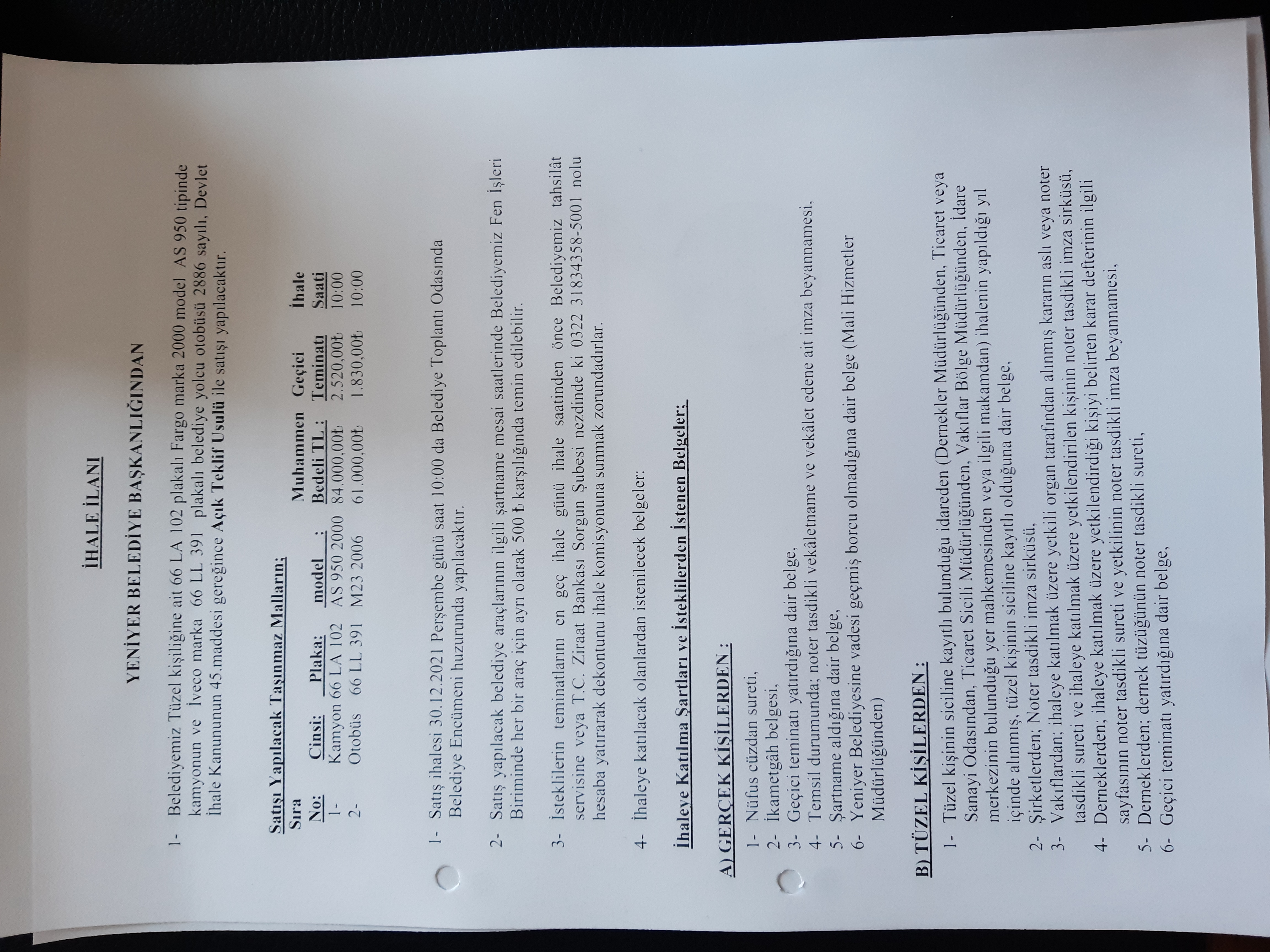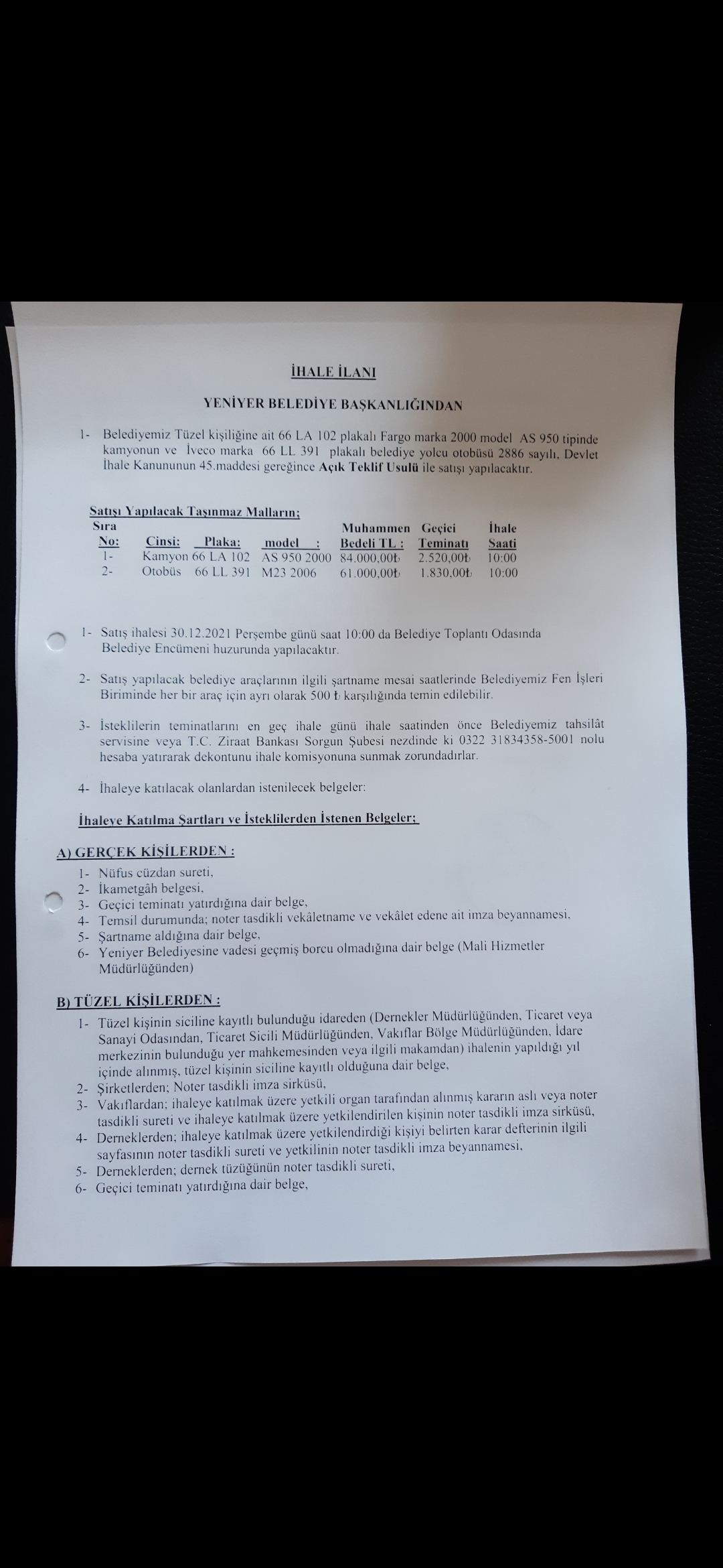 YENİYER BELEDİYESİ TÜZEL KİŞİLİĞİNE AİT 66 LA 102 PLAKALI FARGO MARKA 2000 MODEL AS 950 TİPİNDE KAMYON VE İVECO MARKA 66 LL 391 PLAKALI YOLCU OTOBÜSÜ İHALE İLANI