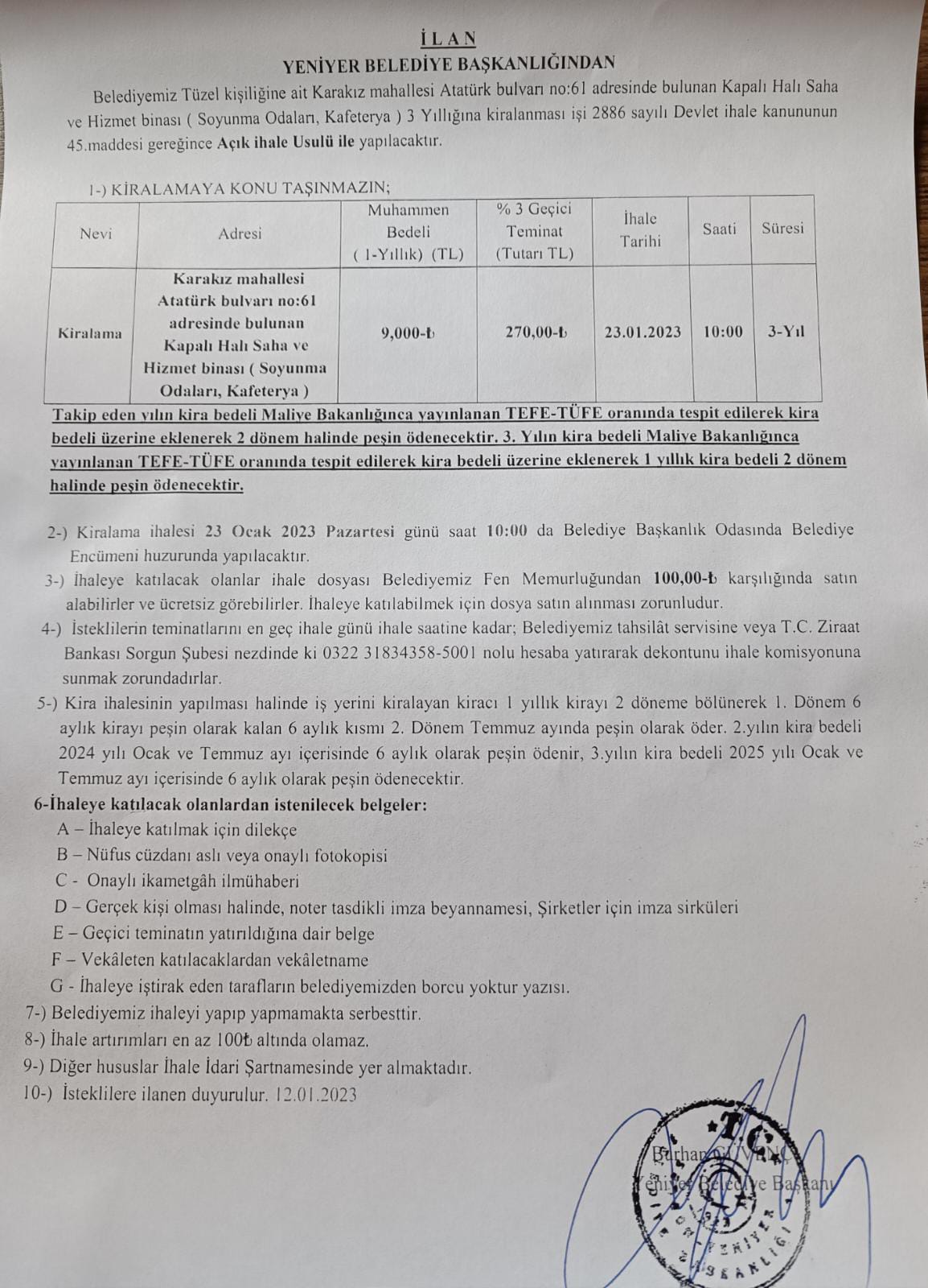 BELEDİYEMİZ TÜZEL KİŞİLİĞİNE AİT KARAKIZ MAHALLESİNDE BULUNAN KAPALI HALI SAHA VE HİZMET BİNASI KİRALAMA İHALE İLANI