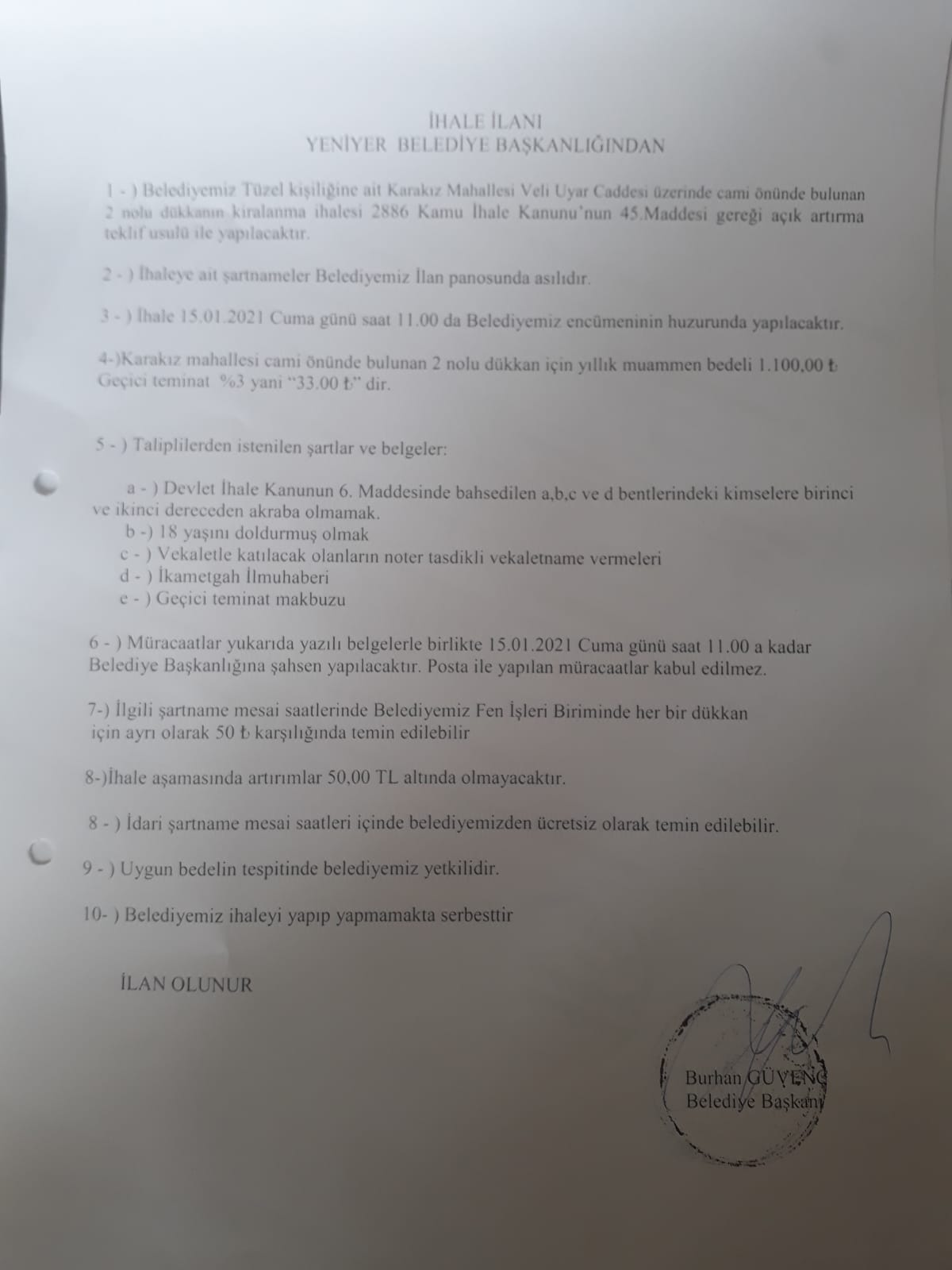YENİYER BELEDİYESİ KARAKIZ MAHALLESİ VELİ UYAR CADDESİ CAMİ ÖNÜ 1 NOLU DÜKKANIN KİRALAMA İHALE İLANI