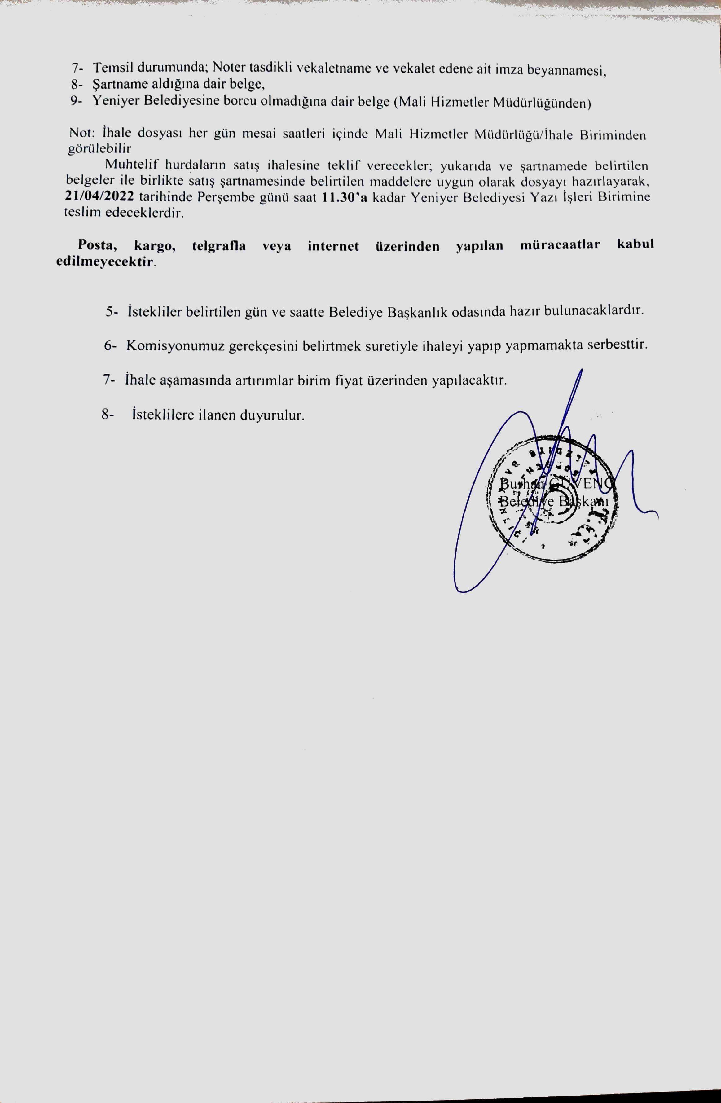 BELEDİYEMİZ TÜZEL KİŞİLİĞİNE AİT BELDEMİZ İÇERİSİNDE MUHTELİF YERLERDE VE HİZMET BİNAMIZ ÇEVRESİNDE BULUNAN HURDA MALZEMELERİN SATIŞI İHALE İLANI